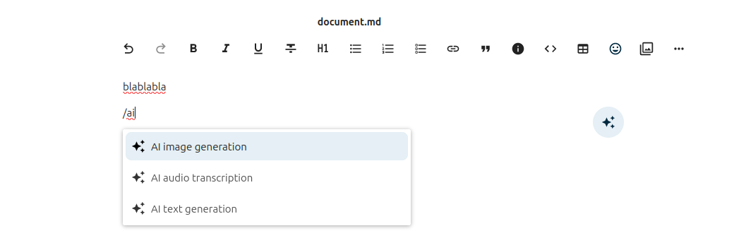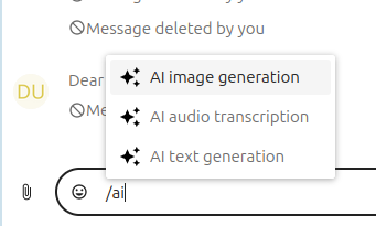 The assistant app provides 3 smart pickers that you can access in Talk, Text and in every place where rich text edition is possible. To use them, type "/" and then "ai". They will appear in the filtered provider list.