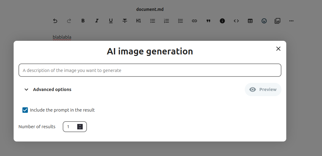 The assistant app provides 3 smart pickers that you can access in Talk, Text and in every place where rich text edition is possible. To use them, type "/" and then "ai". They will appear in the filtered provider list.